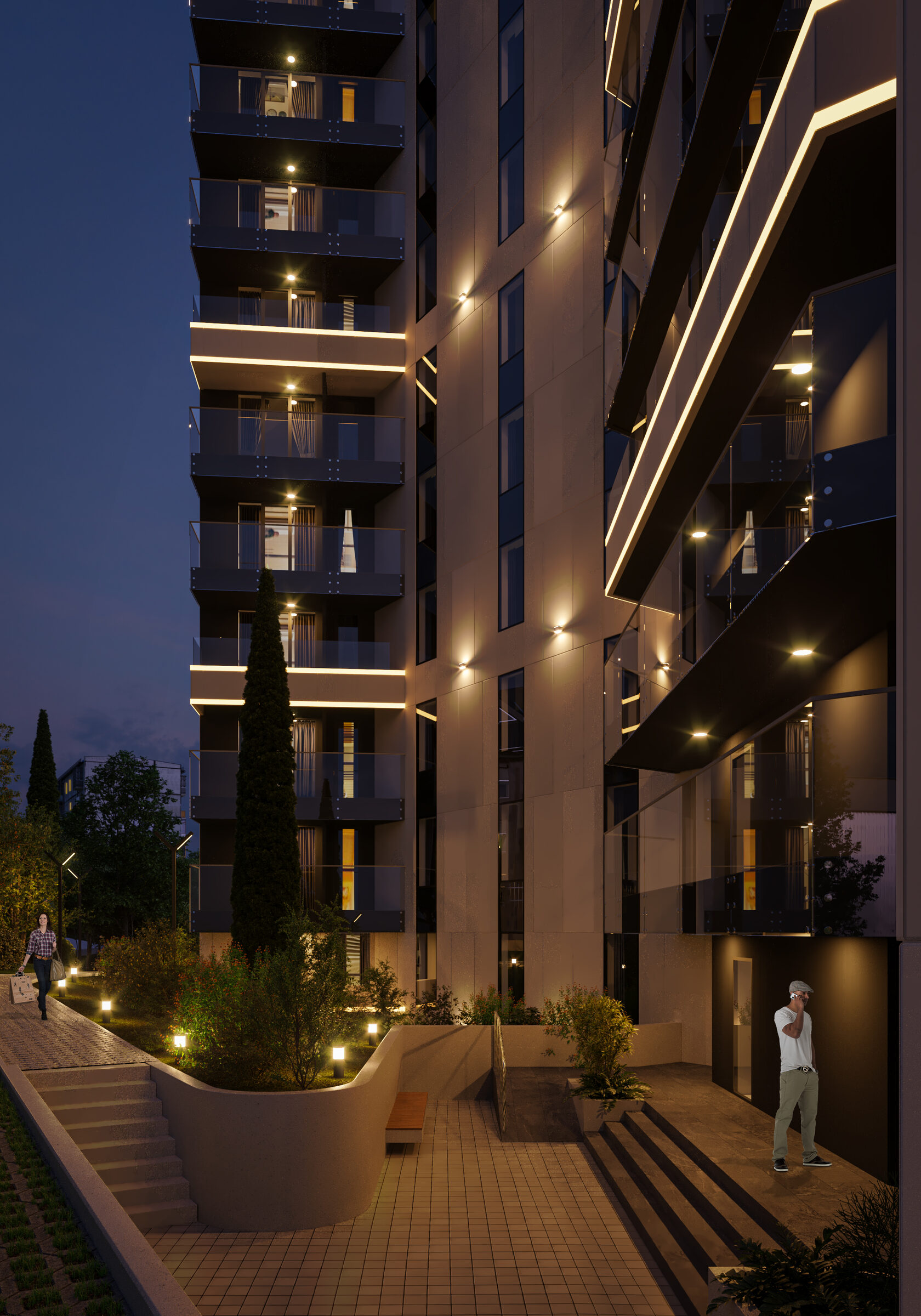 Фасады дома выполнены из высококачественных материалов, во внешней отделки используется алюминиевый алюкобонд, остекление гардиан, оконный профиль рейнерс. Внутренняя часть отбелки включает в себя керамогранит, грильято, качественные двери и декоративное освещение, а так же имеется система умный дом.